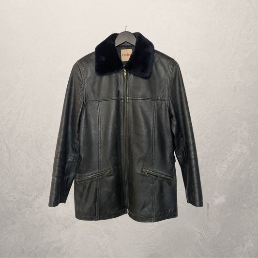 Vintage black blue fur leather jacket L