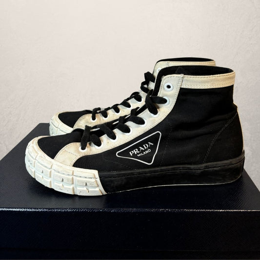 Prada zwart-witte Wheel high-top logo sneakers 44