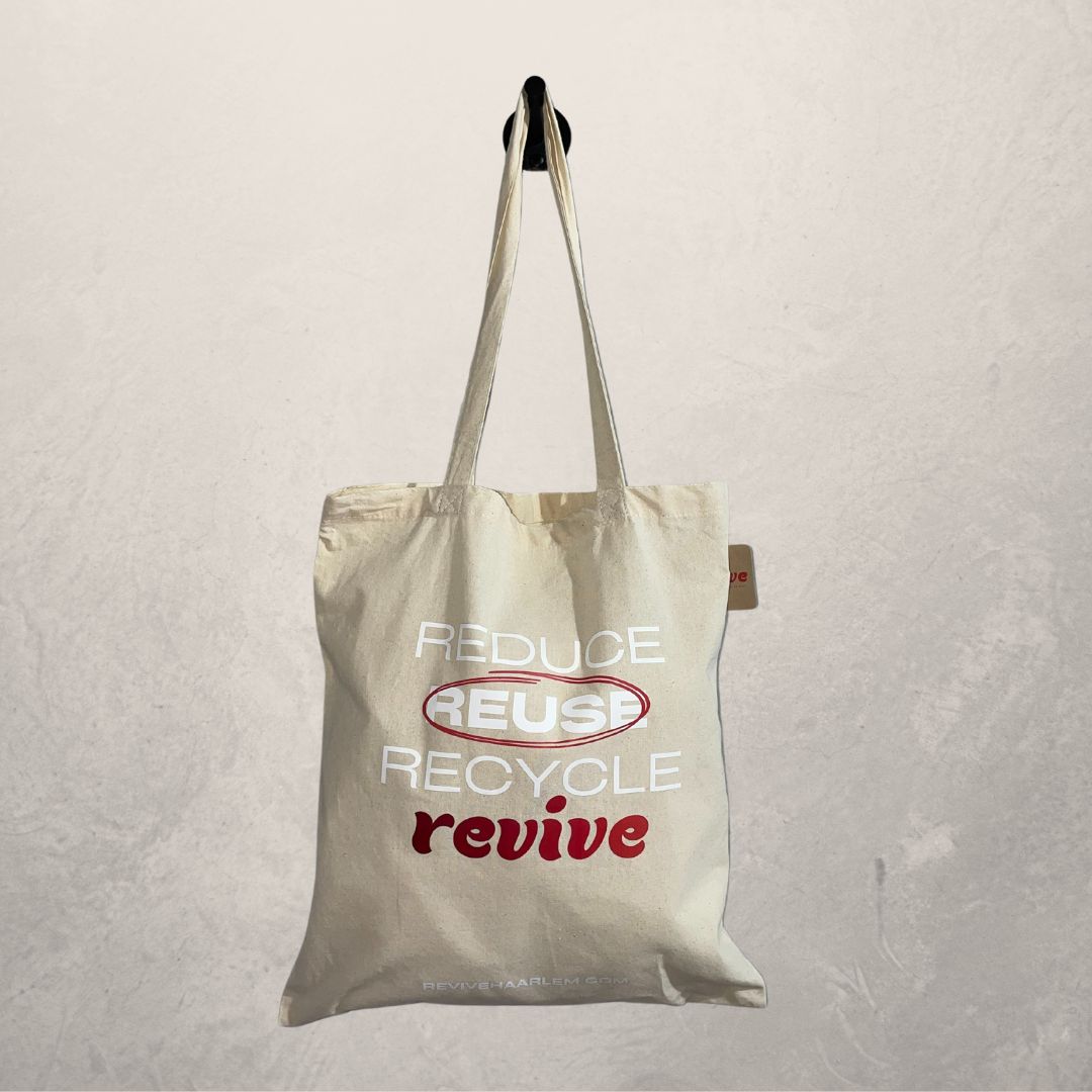 "Reduce, Reuse, Recycle, REVIVE" draagtas van gerecycled katoen