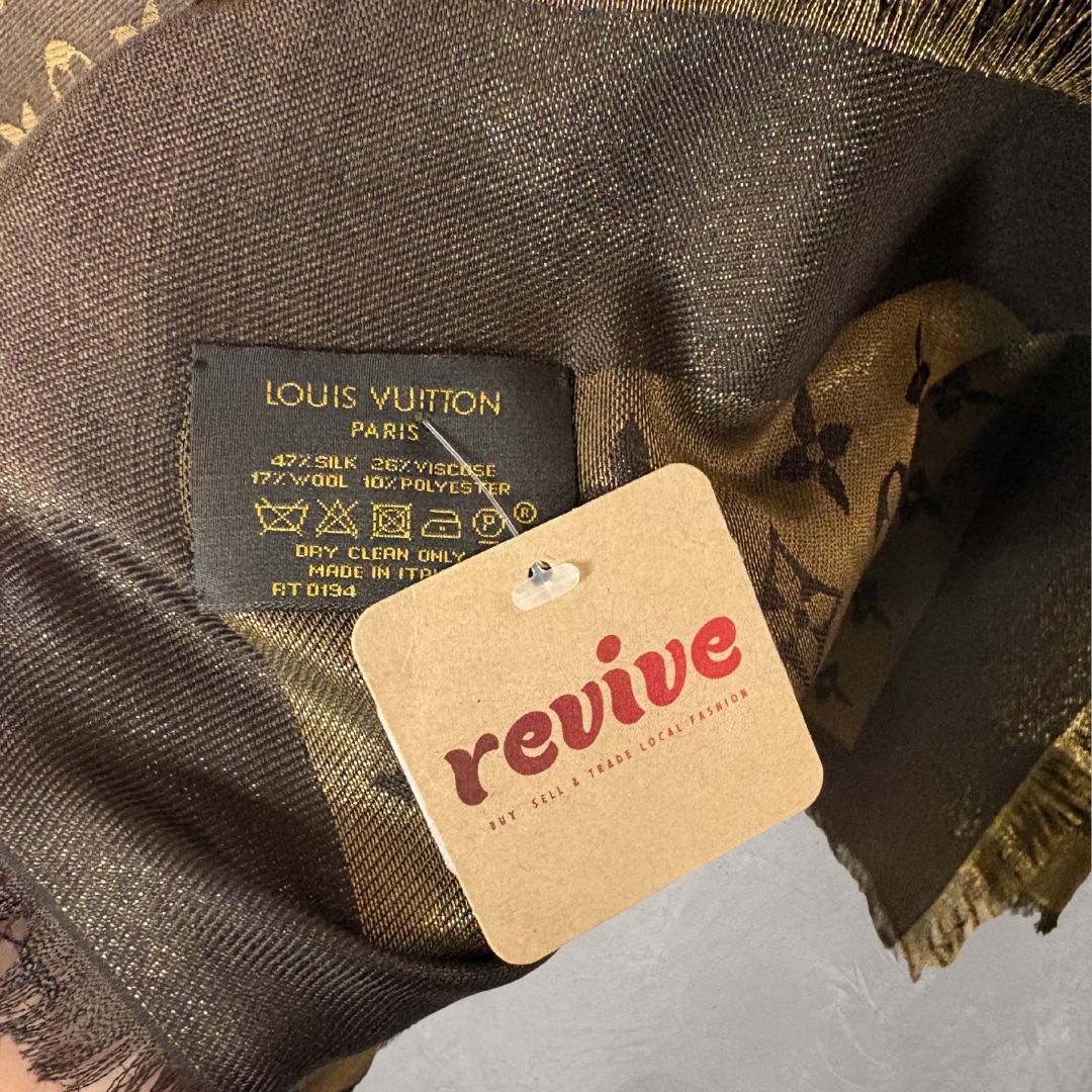 Louis Vuitton brown/ gold shine monogram 47% silk/ 17% wool scarf -145x145cm
